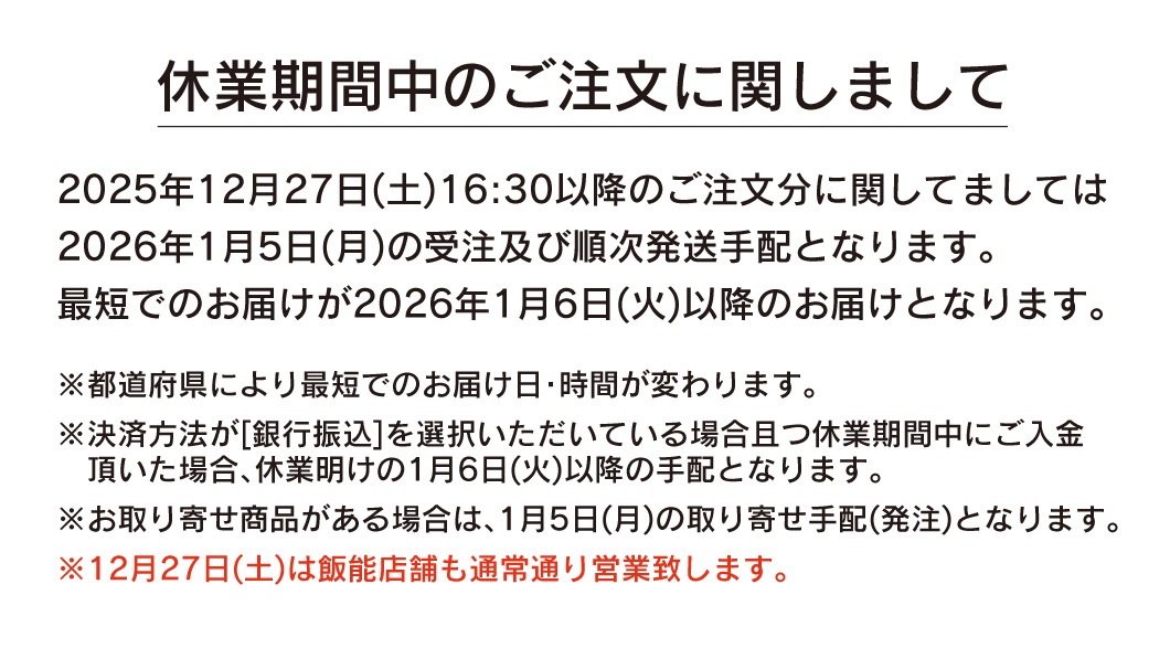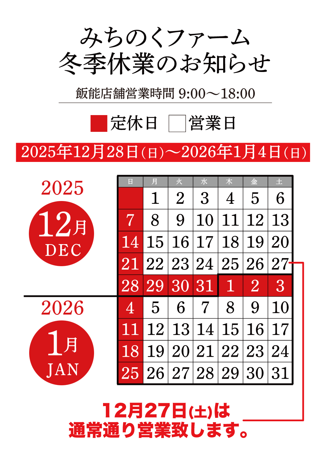 冬季休業期間:2025年12月28日(日)〜2026年1月4日(日)